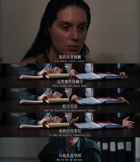 本影片导演是女性,自拍自导自演的,她演的既深刻又克制,没有从男性视角的凝视,看着不脏。 简介:这是一部讲述女性遭受性侵经历及之后带伤生活的电影。 艾格妮丝在读研究生的时候被导师性侵了,她没有经验,也出于恶心洗了澡没留下有力证据,除了一个纽扣。死老登仓惶离职了,剩下她在原地艰难的生存。舍友远渡重洋在纽约工作,结婚,生娃,时不时回来看她,她还住着那个屋子,在母校留校升职加薪工作着,然而内心的一切都变了。 变得没有安全感,变得怕人,见到和导师身形相近的男士就发抖,怀疑自己的成就,莫非导师是因为看上了自己才夸论文写的好,而不是真的因为论文写得好。唯一能给她带来亲密感的是那只流浪猫,紧紧抱着猫,感受那一点温暖。