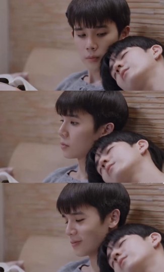 这里Thap俯身过来,依旧是想触碰又收回的手,只是和In对视笑着说「嗯,真好」 BGM一进,两个人一人靠着床,一人靠着床头,Thap看着In,好像什么话都没说,但在两个人的聊天中,两颗心越来越近..