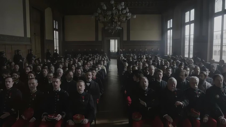 可因此,我也认为电影的平缓与压抑并非节奏失误,而是一种蓄意的反高潮策略。观众等待的煽情时刻,那些义愤填膺的演说、群众山呼海啸的声援、德雷福斯与家人抱头痛哭全被推到画外。 镜头始终留在走廊、办公室、法庭后排的长椅,把历史巨响过滤成纸页翻动、军靴踏地、笔尖划过纸面的窸窣声。当片尾字幕淡淡地告诉我们“德雷福斯 1906 年才完全平反”。 电影真正想拍的并不是昭雪,而是昭雪之前那漫长的、无人鼓掌的拉锯。
