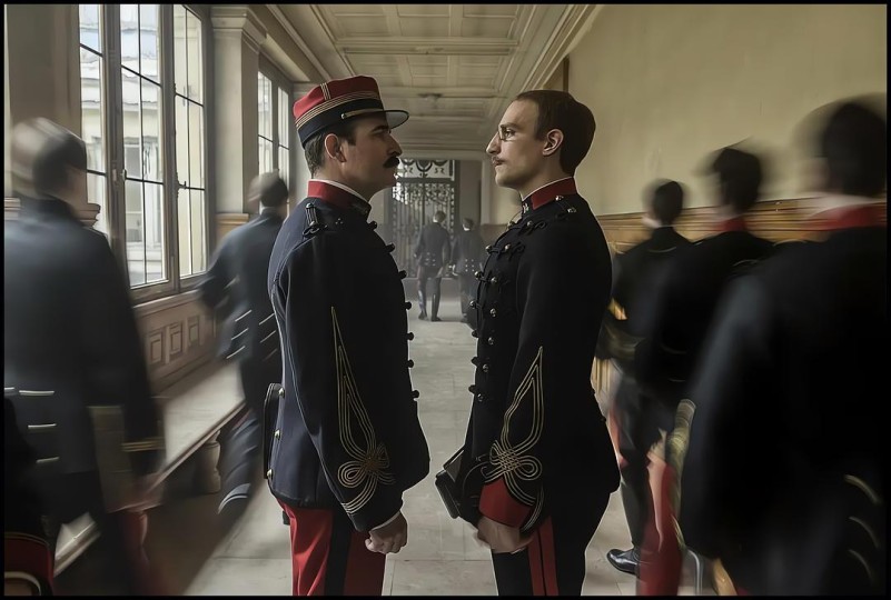 我认为电影本身是相当可以体现导演功力的。场景、服化道、节奏定义与政治讥讽没有一处落于俗套,方正工整的机位和构图,几乎让画面形成了一种呈现油画质感的静态景观。 波兰斯基用教科书般的对称构图、冷冽的布光和一丝不苟的置景,把 1890 年代的法国军队拍成了一座钟表,那些齿轮严丝合缝,却只为碾碎一个无辜的人。镜头极少摇晃,剪辑几乎没有跳切,连呼吸声都被压低,于是整部电影像一幅徐徐展开的军官群像油画,他们体面、僵硬、没有一丝人情味。这种“过度工整”恰恰把观众锁进了体制的内部视角。我们不是来围观英雄的,而是来旁观一台官僚机器如何自我润滑、自我修复。