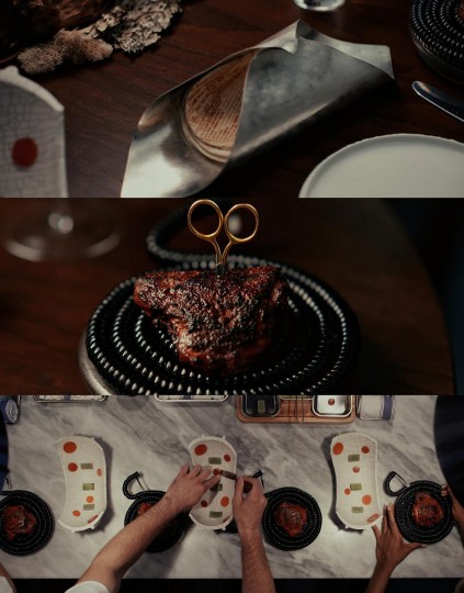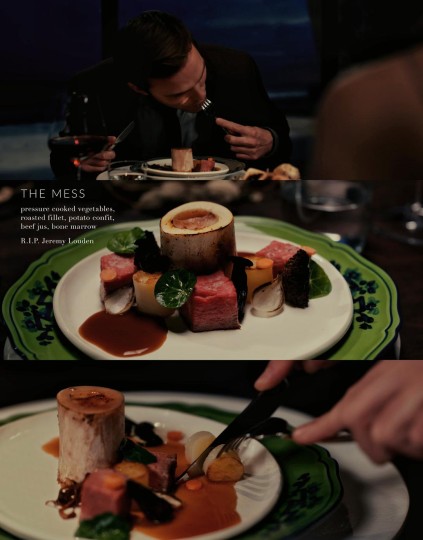 6.第四道菜:“凌乱”——高压煮蔬菜、烤菲力、油封洋芋、牛肉汁、骨髓。 (表达人生即使一切顺利,他人对自己都满意,还是无法逃过凌乱,人生、身体、理智的凌乱,为了取悦永远不会认识的人,你奉献了一切。然后副主厨自行倒下了)