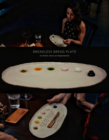 4.第二道菜:无面包面包盘——风味佐料。 (用食物隐喻社会阶层,面包影射穷人)